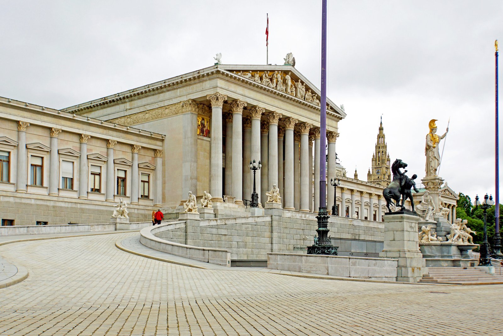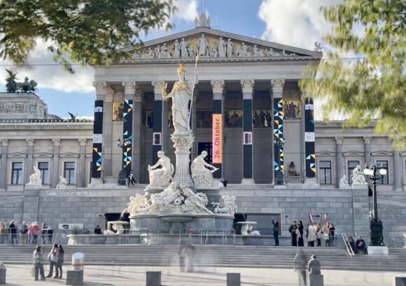 The building’s most iconic feature is the *Pallas Athena Fountain*, located in front of the main entrance. The towering statue of the Greek goddess Athena—goddess of wisdom—symbolizes knowledge and fairness, while figures below her represent the legislative and executive powers. This fountain has become one of the most photographed monuments in Vienna.